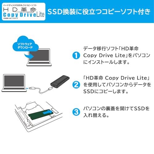 【換装がかんたんにできる!】ハードディスク、SSDのデータを丸ごとコピー!換装に役立つコピーソフトが付属しており、無料でダウンロードできます。,【ノートPCに最適】衝撃に強いコンパクトな外付けSSDは持ち運びにも最適!USB3.2 Gen2の性能を最大限に引き出す超高速転送規格NVMe対応。外付けSSDとして使用した場合の転送速度は1060MB/S!,【家庭用ゲーム機の外付けSSDに】PS4/PS5のゲームデータをダウンロード・保存できます。読込速度が速いため、待ち時間のストレスも少なく快適にゲームを楽しむことができます。,【ねじ止めなし!楽々装着】完全スクリューレス設計でドライバーでねじ止めすることなくスムーズに取り付けることができます。,【放熱シート採用】SSDが壊れる原因の温度上昇を抑え、データ転送速度の低下(サーマルスロットリング)の発生を抑止するシリコン製放熱シートを付属。