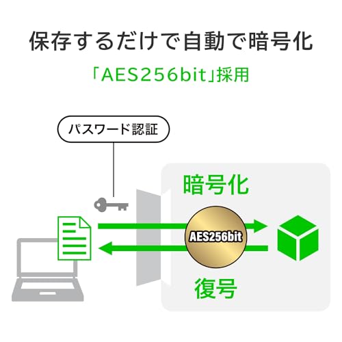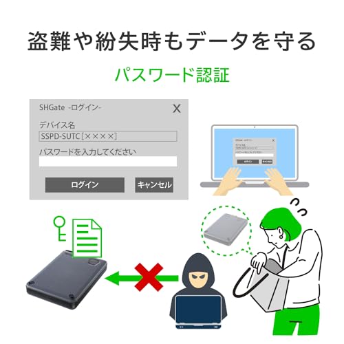 【ハードディスクよりも転送速度が高速!】SSDはハードディスクと比べて読み書きが速く、データへのアクセスにかかる時間が大幅に短縮されます。本商品「SSPD-SUTCシリーズ」はSSDを搭載しているため、ハードディスクモデル「HDPD-SUTCシリーズ」と比べるとデータの転送速度が速く、より快適にご使用いただけます。,【【Wの安心】I 情報漏洩を防ぐ安心設計】「ハードウェア自動暗号化」「パスワードロック」「ケンジントンスロット」で、あなたの大切なデータを強力に守ります。,【【Wの安心】II 外的リスクからデータを守る筐体設計】頻繁に持ち歩くポータブルSSDだからこそ、耐衝撃性は欠かせません。外装には柔軟で耐久性の高いTPU素材、内装には衝撃に強いPC素材を採用し、本体内部には衝撃吸収ダンパーを搭載。ドライブ自体への落下の衝撃を軽減する設計になっています。SSDは駆動部分が無い構造のため、振動・衝撃による故障リスクがハードディスクよりもさらに低減されます。また、雨やホコリがポートから侵入しないよう、『防雨防塵キャップ』もついています。,【Windows/Mac両対応!USB-C(R)ケーブ