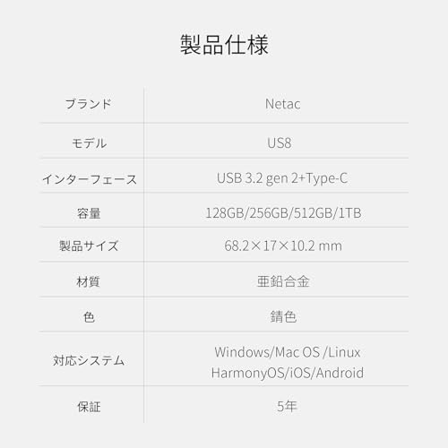容量: Netac US8 外付けSSD 256GB USB3.2Gen2 Type-AおよびType-C対応,速度: 読み出し高达550MB/秒、書き込み最大500MB/秒,適用システム:Windows 7/8/10+ Mac OS X 10.5 + Linux 2.6.x またはそれ以上,高品質の亜鉛合金を使用した回転式のデザインと、50グラムのコンパクトで軽量なケースは、デザイン性と携帯性を兼ね備えている。,安心保証 -5年間の限定正规保証
