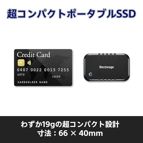 Nextorageはソニーカメラ用メモリーカードを開発してきた元ソニーエンジニア達が立ち上げた会社です。,クレジットカードサイズのUSB3.2 Gen2 対応のPortable SSD,インターフェース:USB 3.2 Gen 2 (SuperSpeed USB 10Gbps) / 最大読出し速度1050MB/s、最大書き込み速度1000MB/s,超小型で軽量ながら高速転送を実現: 約66 mm×40 mm×9 mm(最大突起物を除く)、本体 約 19 g、キャリングポーチ 約 5 g,対応OS・機器:Windows11、Windows10、macOS 11以降、iPadOS 13.4以降、Chrome OS、Android OS10、Android OS9、iPhone15 Pro、iPhone15 Pro Max、PlayStation5、PlayStation4、ROG Ally、Steam Deck OLED、Legion Go ※詳細はNextorageホームページをご確認ください。,同梱物:L字型 USB Type-C to C接続ケーブル (約16.5cm)、シール付き面
