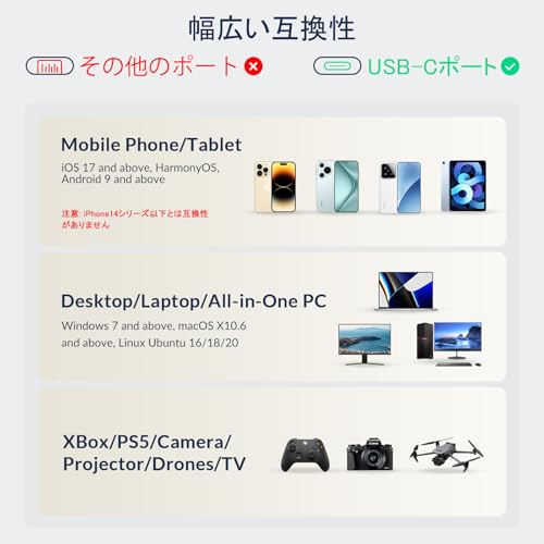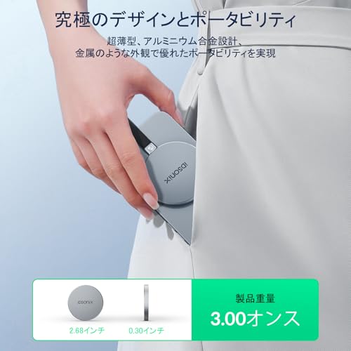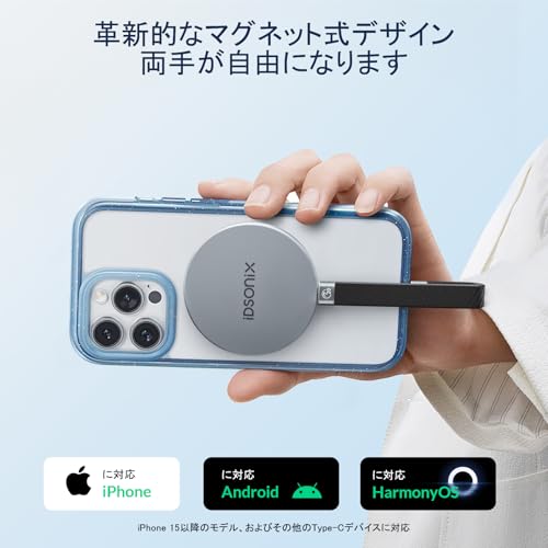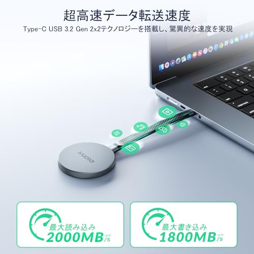 iDsonixポータブル外付けSSDは、厚さわずか7.5mmで軽量コンパクトです。転送速度は最大2000MB/秒。512GB、1TB、2TBの大容量モデルをご用意しています。,iDsonix 外付けハードドライブ SSD は、iPhone 15 シリーズ、Android モバイルデバイス、ラップトップ、カメラ、Xbox、PS4、PS5、ゲームコンソールなどと幅広く互換性があります。,革新的なマグネット設計:この外付けSSDは、MagSafe磁気機能搭載デバイスに簡単に接続できます。他のデバイスにも、MagSafeステッカーを使用してしっかりと固定できます。,簡単な 4K ビデオ ストレージ:iPhone 15 Pro / Pro Max 以降のバージョン向けに特別に設計されたこの外付け SSD を使用すると、4K 60FPS ProRes ビデオを簡単にキャプチャして保存できます。,忙しい出張中は、このポータブルSSDをノートパソコンに接続して、企画書や提案書のファイルを20Gbpsで高速転送できます。ホテルの部屋では、その日の作業のバックアップとしてお使いいただけます。,屋外での撮影