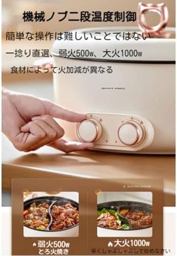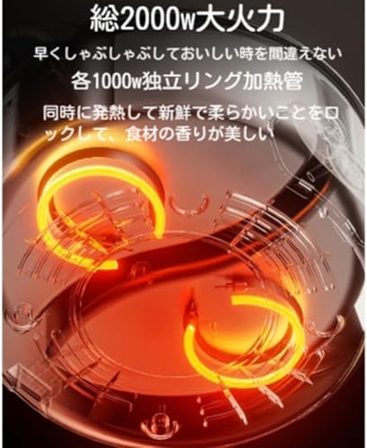 2000Wの高パフォーマンス:2つの調理エリアが独立して制御でき、それぞれ1000Wのリング型ヒーターが備えられています。1つのエリアでは500Wの低消費電力モードと1000Wの高消費電力モードを切り替えることができます。,食品に接触する不粘コーティング:陶晶不粘コーティングを使用しており、油分を少なくして煙を抑え、調理中の食材が粘りにくいです。食事後の洗浄も簡単です。,安全機能:過熱や水位が少なくなったり水がなくなったりする場合、自動的に安全装置が動作し、不慮の事態を防ぎます。,6リットルの大容量:5~6人分の食事を一つの鍋で十分に調理でき、家族や友人との食事会にも最適です。,多機能性:火勢を細かく調整できるため、煮物、炒め物、スープ作りなど、多様な調理方法に対応でき、家庭料理の幅を広げます。