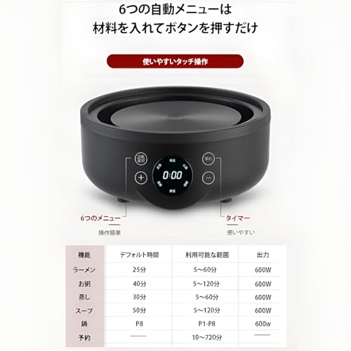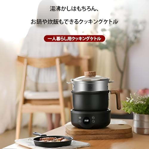 【多機能電気鍋】: 温度調節可能なノブが付いているので、1~2人または一人暮らしに最適、さまざまな従来のストーブキッチン用品に取って代わり、さまざまな調理方法に対応できます。,【便利な調理器具】1.8リットルの電気調理器はミニサイズなので、保管や持ち運びに便利です。 分割式なのでお掃除の負担が増えず、ポットは食器としても使えます。 旅行が好きなら、コンパクトなサイズなので、旅行に持っていくことができます。,【急速加熱と安全性】鍋の大きな円形の発熱体が食材を均一に加熱し、従来のコンロキッチン家電よりも早くおいしい食事を調理し、食材の焦げを防ぎます。 また、電気調理器には過熱保護機能が付いており、空焚きや過熱した場合に自動的に電源が切れます。,【焦げ付き防止/お手入れ簡単】電気フライパンの表面は食品グレードの焦げ付き防止コーティングで作られており、お手入れが簡単です。 鍋の中で食材をスムーズに炒めることができ、こびりつきを防ぎ、脂肪分の少ない食材を調理することができ、料理をより健康的にします。 調理後は水と布で表面を拭くだけです。,【その他の機能】炊飯器には扱いやすい長い火傷防止ハンドルと