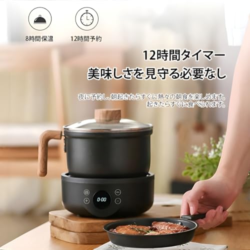 電気鍋 グリル鍋 一人用 1.8L大容量 IH対応 600W 多機能電気鍋 焦げ防止 火力調節可能 12時間タイマー 8時間保温付 ポータブル 電気調理器 一台多役 クッキングケトル フライパン しゃぶしゃぶ/炊飯/煮込み/焼肉兼用 一人暮らし/カップル
